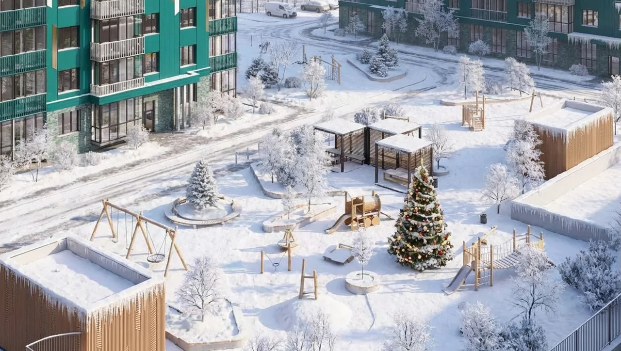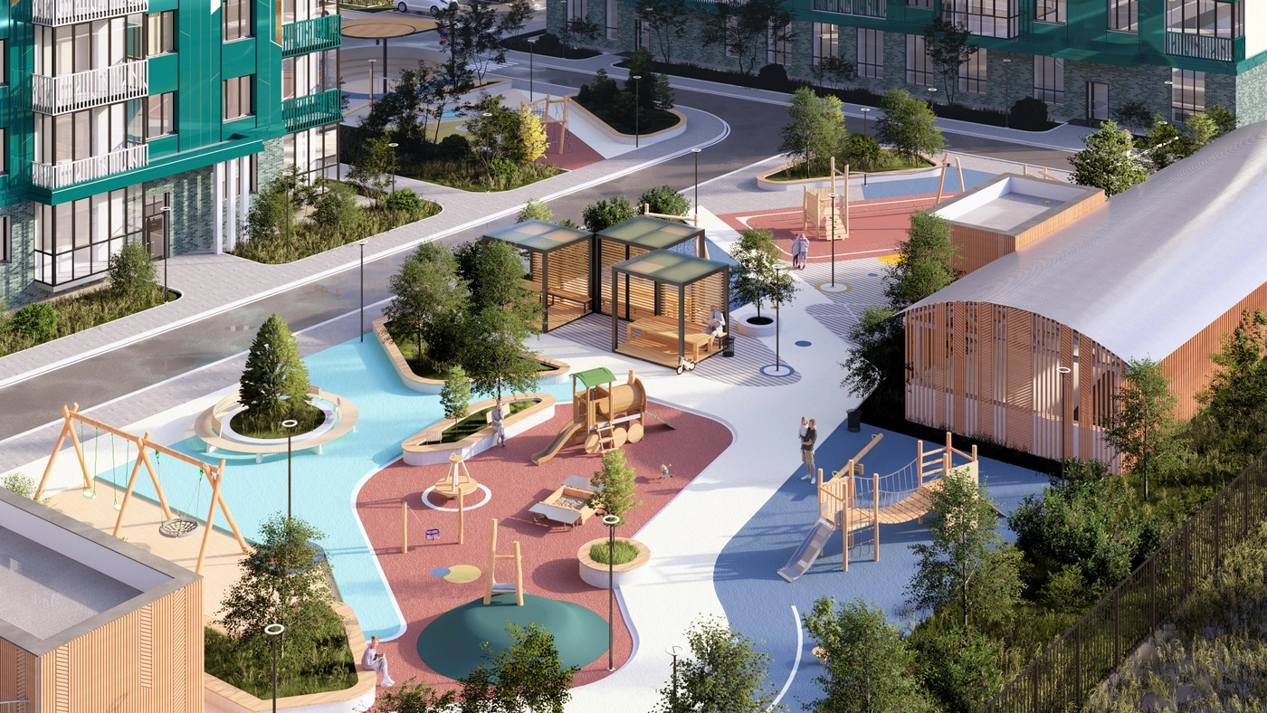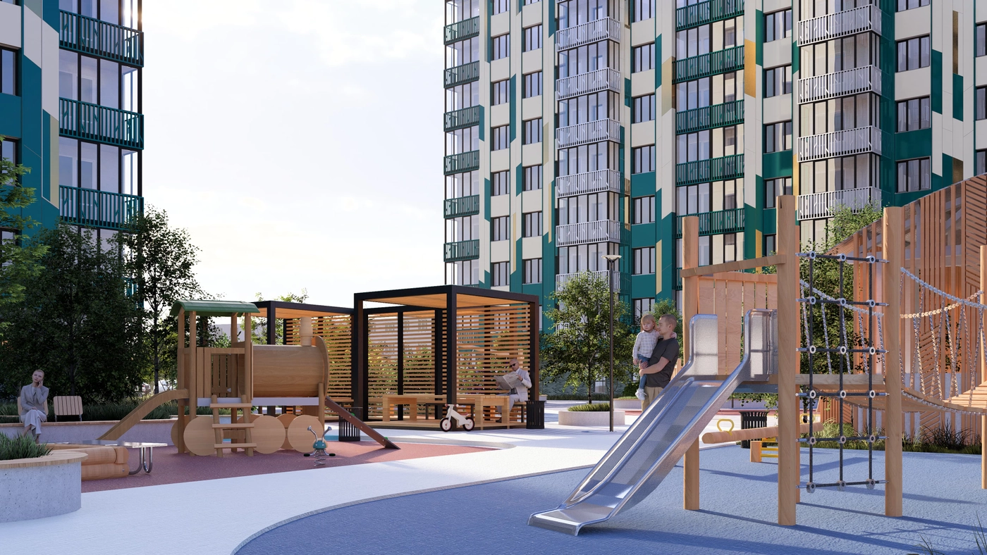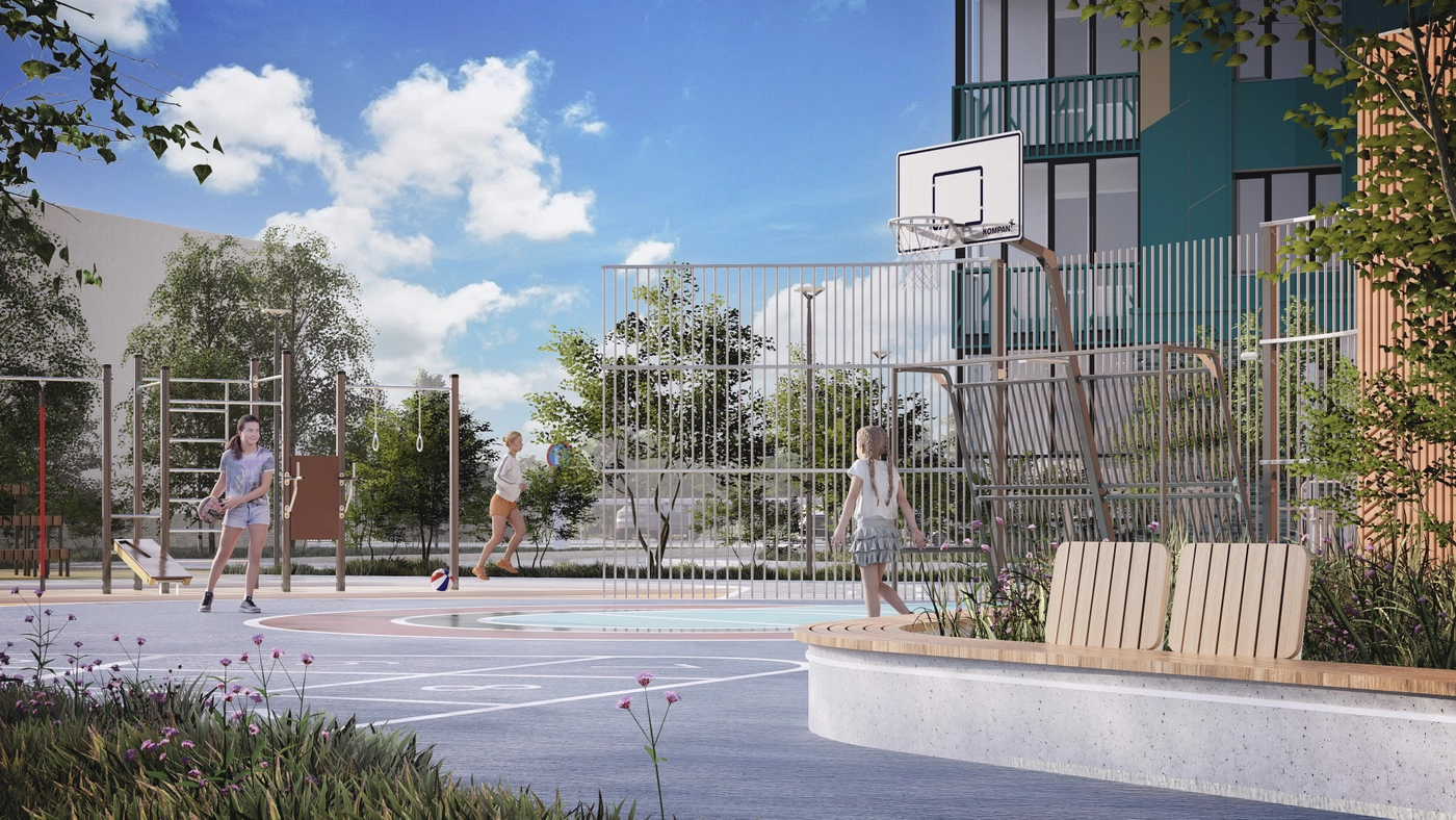 Застройщик создает пространство с заботой о физическом и ментальном здоровье жителей.Здесь продуманы удобные спортивные площадки, система освещенияво дворах и внутри домов, спокойные тона в оформлении фасадов.